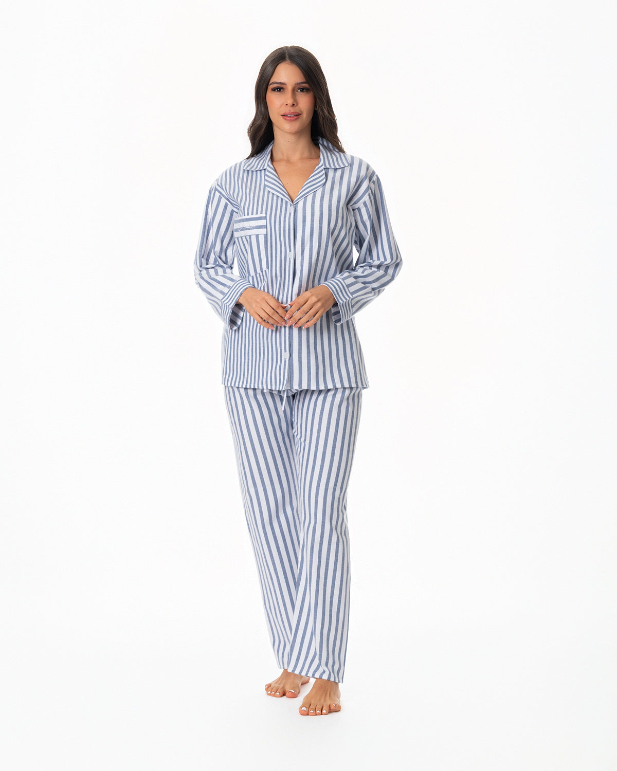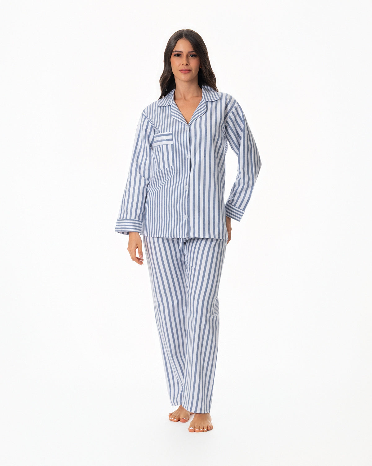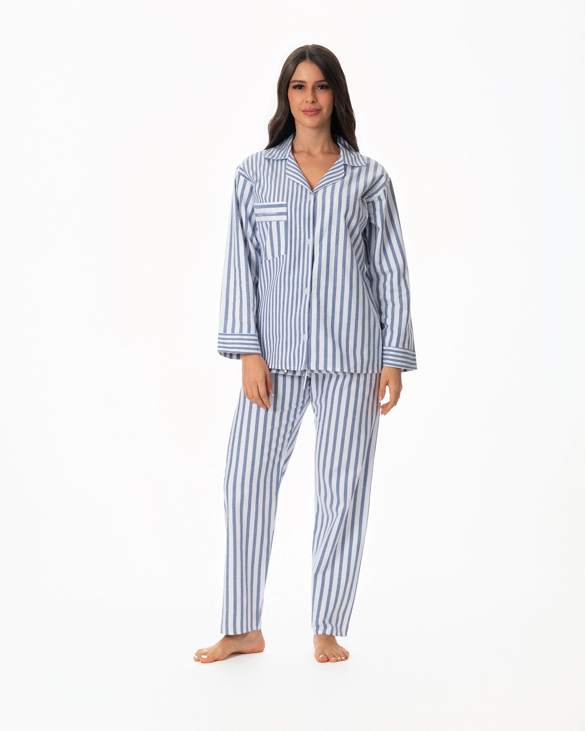 Pijama para dama, con blusa recta abierta, con botones y bolsillo en la parte superior derecha y manga larga.