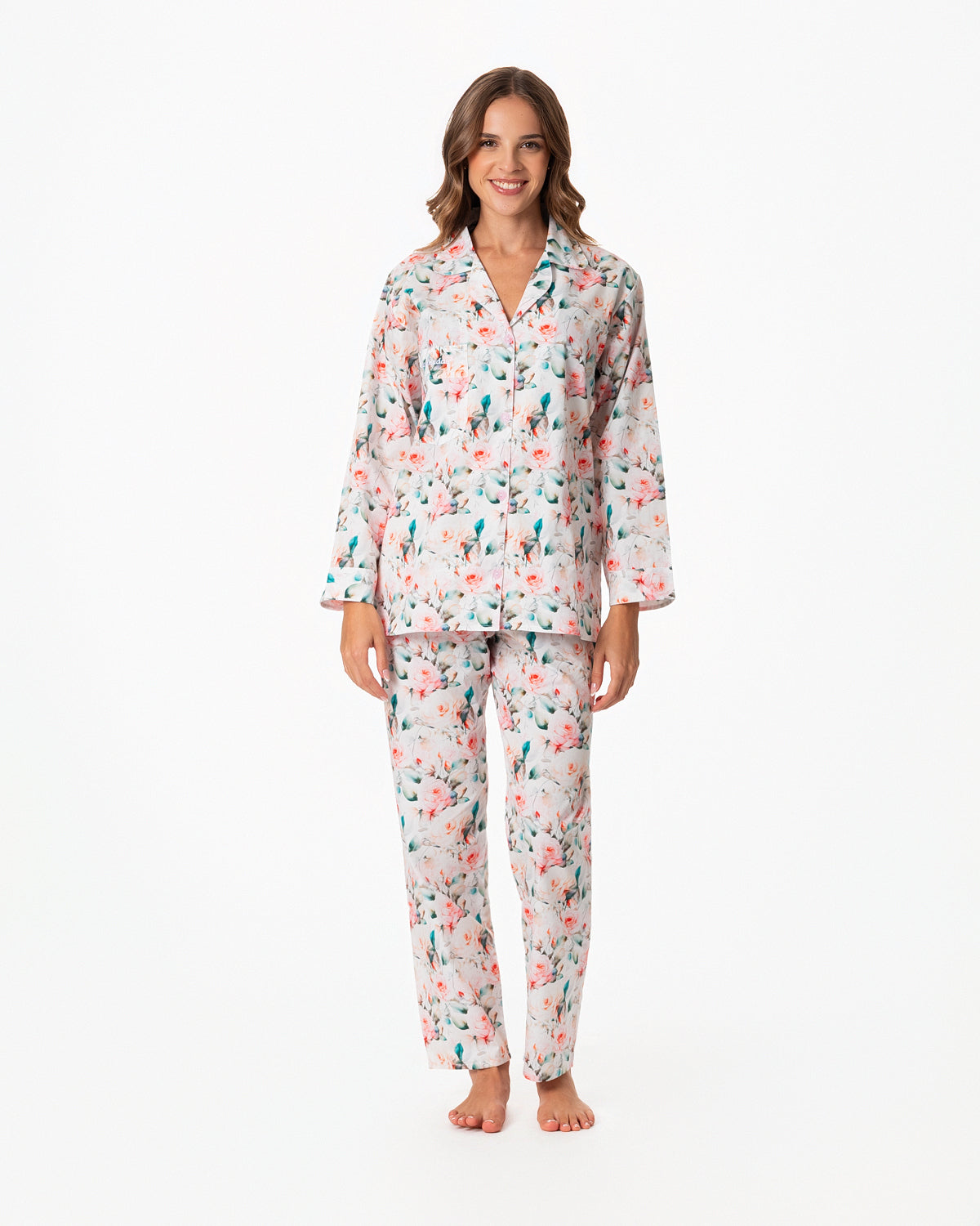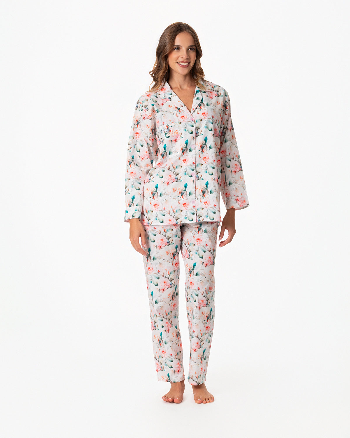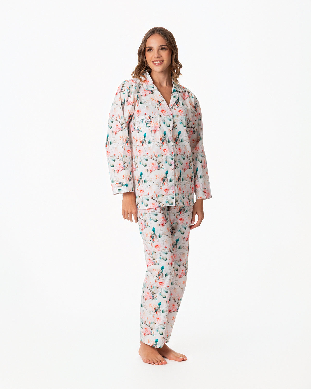Pijama para dama, con blusa recta abierta, con botones y bolsillo en la parte superior derecha y manga larga.