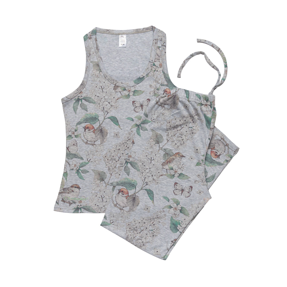 Pijama para dama tejido de punto, estilo ceñido al cuerpo, camiseta manga sisa con cuello redondo.